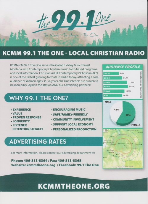 KCMM 99.1 The One has a variety of affordable advertising options. FREE production with any flight. Call our business office today and ask for Mark. (406) 813-8364 or email mark@kcmmtheone.org
